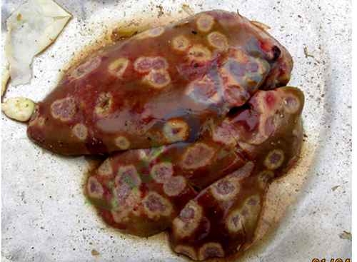 Vết hoại tử chính là khối u tăng sinh, bề mặt gồ lên, khối U thường có màu vàng nhạt đến vàng chanh trên nền gan sưng, cắt đôi vết hoại tử ta không thấy có dạng hình nón ngược, ổ hoại tử gọn gàng hơn, vết hoại tử (khối u) xuất hiện cả ở mặt tiếp giáp giữa 2 thùy gan.